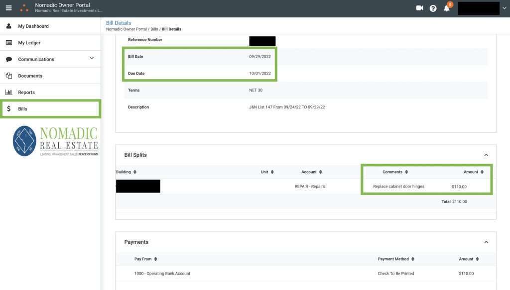 You can view bills at any time in your portal, and can click into the bill to view more details such as the bill date, a description of the charge, the vendor associated with the bill, etc.
