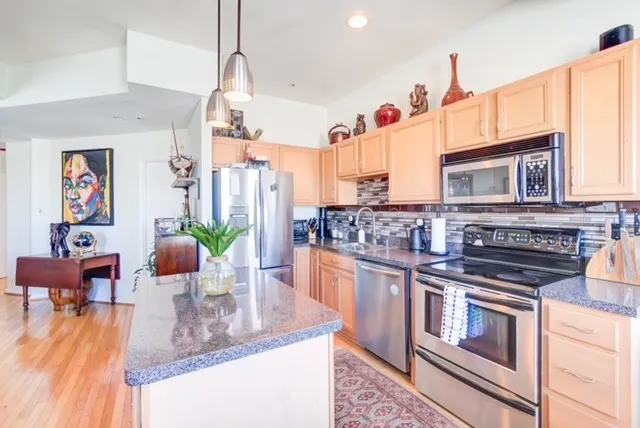 You will love this beautiful upscale condo building with stunning city views from the rooftop deck. Living space features hardwood floors, oversized windows, and a bright, airy layout with contemporary neutral finishes. Plenty of room for both living and dining. Spacious kitchen with abundant cabinetry, granite countertops, a large center island, modern tile backsplash, and stainless-steel appliances. Two generously sized bedrooms with great closet space, and two well-appointed, bright bathrooms. Washer and dryer in unit!