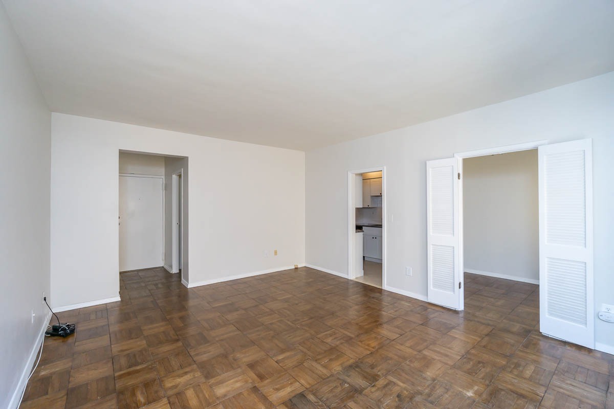 Large, light-filled 1 bed, 1 bath apartment with trendy mid-century modern wood parquet floor. Plenty of room for all kinds of living and dining arrangements. All utilities included. Street parking available