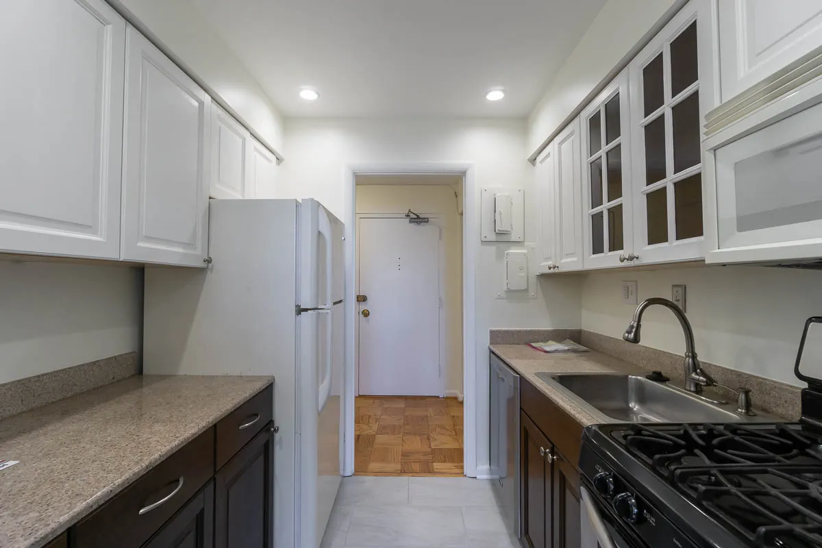 Spacious, open living and dining space with lovely mid-century-style wood parquet floors. Plenty of room for all kinds of living and dining arrangements. Sizable, efficient galley kitchen with tons of cabinet storage. Large bedroom featuring lots of natural light. Private deck that makes the perfect spot to dine outdoors or relax in good weather.